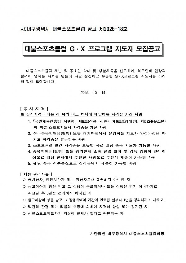 대불스포츠클럽 G·X 프로그램 지도자 모집공고