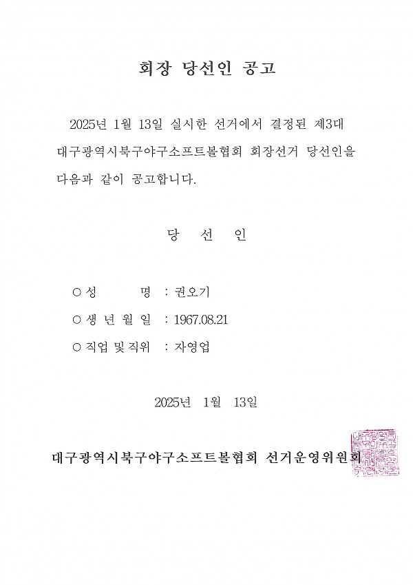 북구야구소프트볼협회 회장 당선인 공고 페이지 정보 작성자 관리자 작성일25-01-13 12:19 조회316회 댓글0건 이전글 다음글 목록 본문 댓글목록 등록된 댓글이 없습니다. 이전글 다음글 목록
