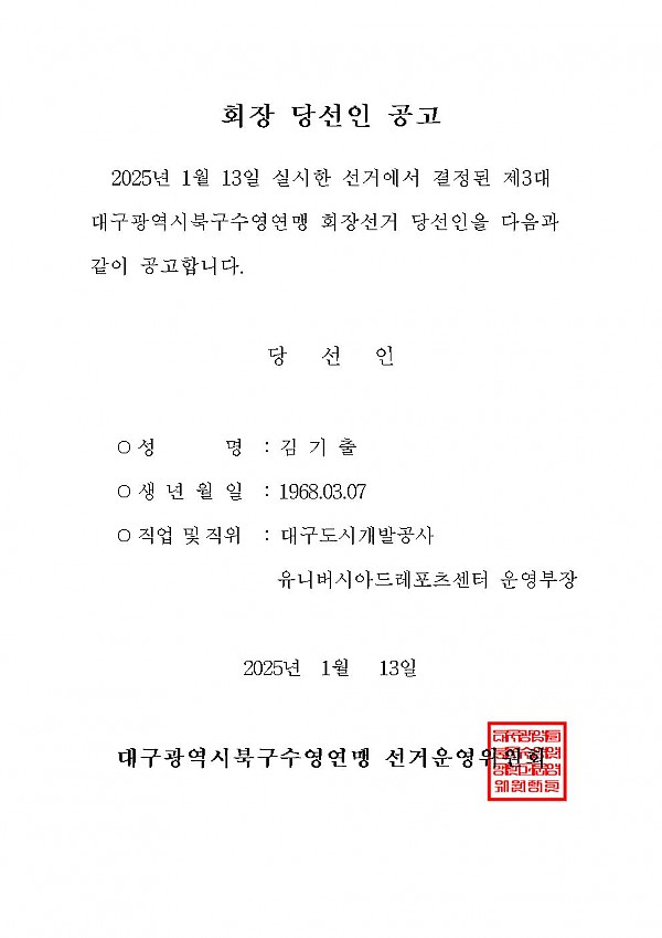 북구수영연맹 회장 당선인 공고 페이지 정보 작성자 관리자 작성일25-01-13 17:33 조회292회 댓글0건 이전글 다음글 목록 본문 댓글목록 등록된 댓글이 없습니다. 이전글 다음글 목록