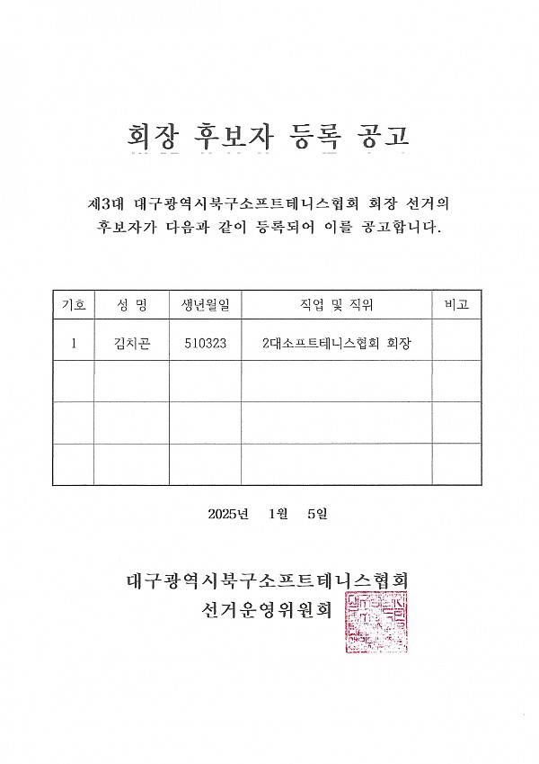 북구소프트테니스협회 회장후보자 등록공고 페이지 정보 작성자 관리자 작성일25-01-05 20:31 조회314회 댓글0건 이전글 다음글 목록 본문 댓글목록 등록된 댓글이 없습니다. 이전글 다음글 목록
