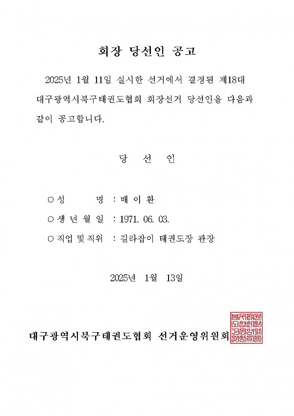 북구태권도협회 회장 당선인 공고 페이지 정보 작성자 관리자 작성일25-01-13 09:21 조회289회 댓글0건 이전글 다음글 목록 본문 댓글목록 등록된 댓글이 없습니다. 이전글 다음글 목록