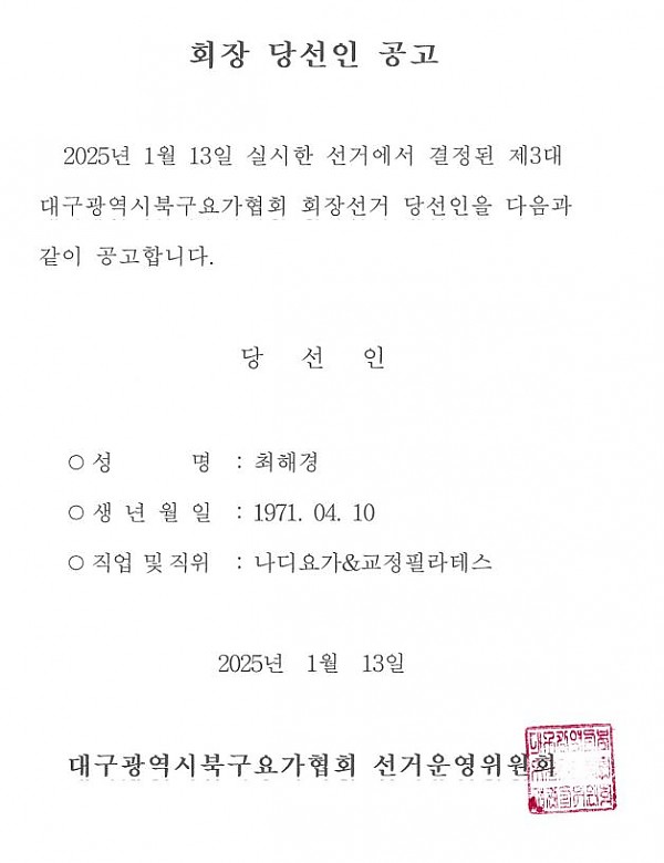 북구요가협회 회장 당선인 공고 페이지 정보 작성자 관리자 작성일25-01-13 12:09 조회316회 댓글0건 이전글 다음글 목록 본문 댓글목록 등록된 댓글이 없습니다. 이전글 다음글 목록