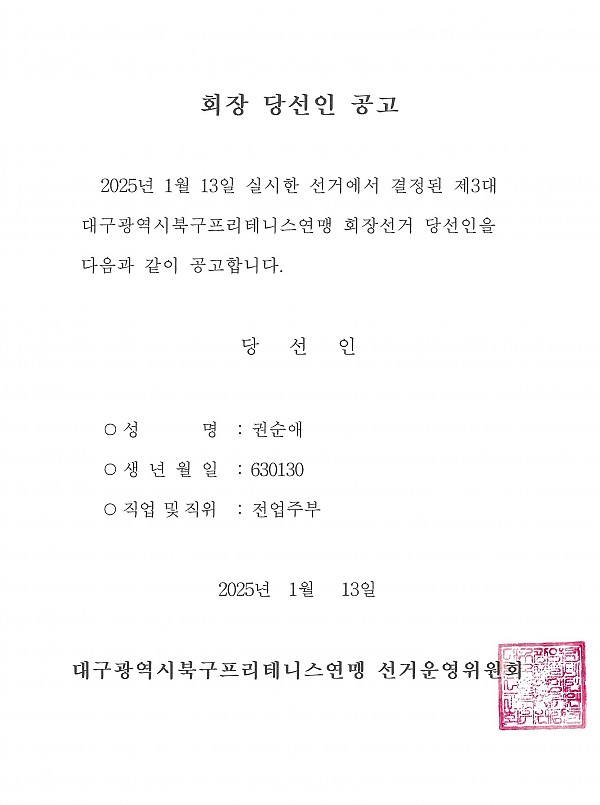 북구프리테니스연맹 회장 당선인 공고 페이지 정보 작성자 관리자 작성일25-01-13 12:12 조회280회 댓글0건 이전글 다음글 목록 본문 댓글목록 등록된 댓글이 없습니다. 이전글 다음글 목록