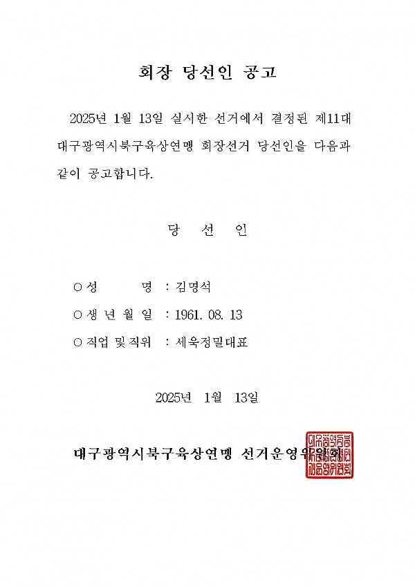 북구육상연맹 회장 당선인 공고 페이지 정보 작성자 관리자 작성일25-01-13 12:14 조회298회 댓글0건 이전글 다음글 목록 본문 댓글목록 등록된 댓글이 없습니다. 이전글 다음글 목록