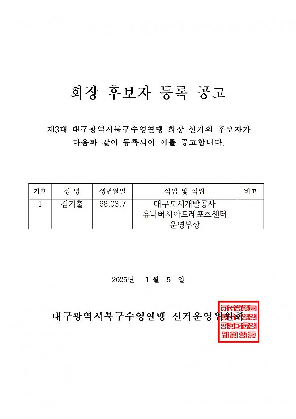 북구수영연맹 회장후보자 등록공고 페이지 정보 작성자 관리자 작성일25-01-05 19:59 조회274회 댓글0건 이전글 다음글 목록 본문 댓글목록 등록된 댓글이 없습니다. 이전글 다음글 목록