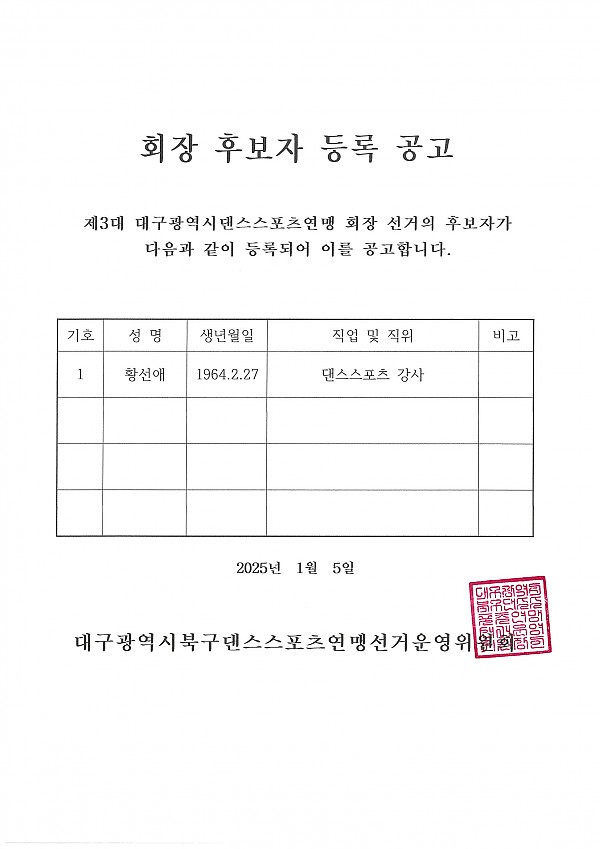 북구댄스스포츠연맹 회장후보자 등록공고 페이지 정보 작성자 관리자 작성일25-01-05 20:01 조회285회 댓글0건 이전글 다음글 목록 본문 댓글목록 등록된 댓글이 없습니다. 이전글 다음글 목록