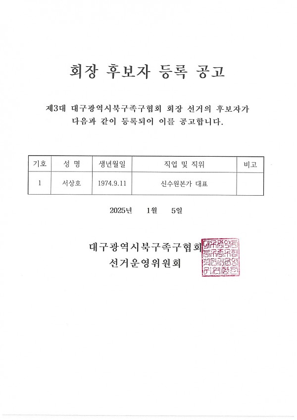 북구족구협회 회장후보자 등록공고 페이지 정보 작성자 관리자 작성일25-01-05 20:02 조회255회 댓글0건 이전글 다음글 목록 본문 댓글목록 등록된 댓글이 없습니다. 이전글 다음글 목록