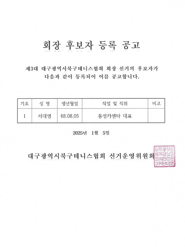 북구테니스협회 회장후보자 등록공고 페이지 정보 작성자 관리자 작성일25-01-05 20:02 조회276회 댓글0건 이전글 다음글 목록 본문 댓글목록 등록된 댓글이 없습니다. 이전글 다음글 목록