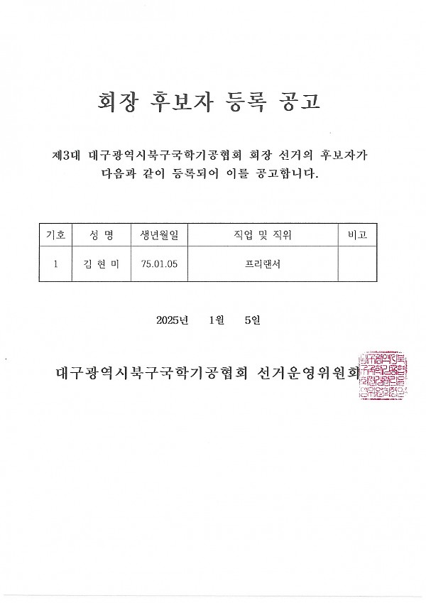 북구국학기공협회 회장후보자 등록공고 페이지 정보 작성자 관리자 작성일25-01-05 20:03 조회275회 댓글0건 이전글 다음글 목록 본문 댓글목록 등록된 댓글이 없습니다. 이전글 다음글 목록