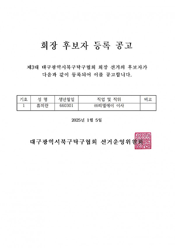 북구탁구협회 회장후보자 등록공고 페이지 정보 작성자 관리자 작성일25-01-05 20:06 조회285회 댓글0건 이전글 다음글 목록 본문 댓글목록 등록된 댓글이 없습니다. 이전글 다음글 목록