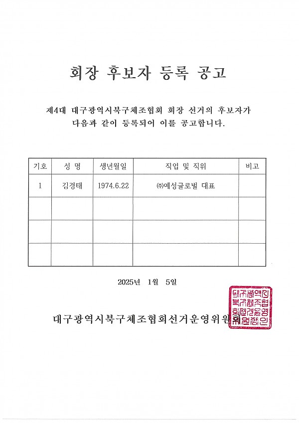 북구체조협회 회장후보자 등록공고 페이지 정보 작성자 관리자 작성일25-01-05 20:07 조회289회 댓글0건 이전글 다음글 목록 본문 댓글목록 등록된 댓글이 없습니다. 이전글 다음글 목록
