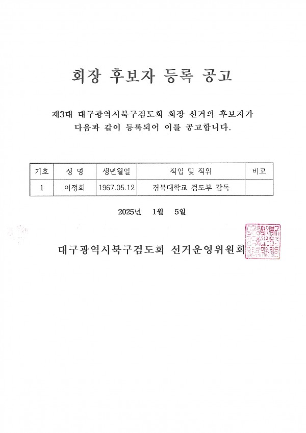 북구검도회 회장후보자 등록공고 페이지 정보 작성자 관리자 작성일25-01-05 20:09 조회304회 댓글0건 이전글 다음글 목록 본문 댓글목록 등록된 댓글이 없습니다. 이전글 다음글 목록