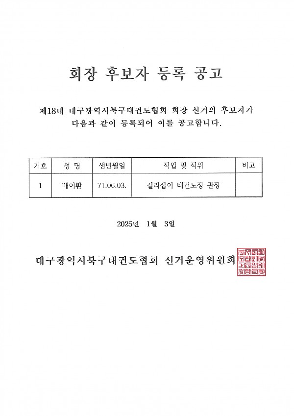 북구태권도협회 회장후보자 등록공고 페이지 정보 작성자 관리자 작성일25-01-03 20:21 조회285회 댓글0건 이전글 다음글 목록 본문 댓글목록 등록된 댓글이 없습니다. 이전글 다음글 목록