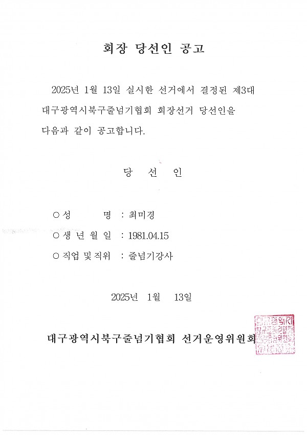 북구줄넘기협회 회장 당선인 공고 페이지 정보 작성자 관리자 작성일25-01-13 12:10 조회293회 댓글0건 이전글 다음글 목록 본문 댓글목록 등록된 댓글이 없습니다. 이전글 다음글 목록