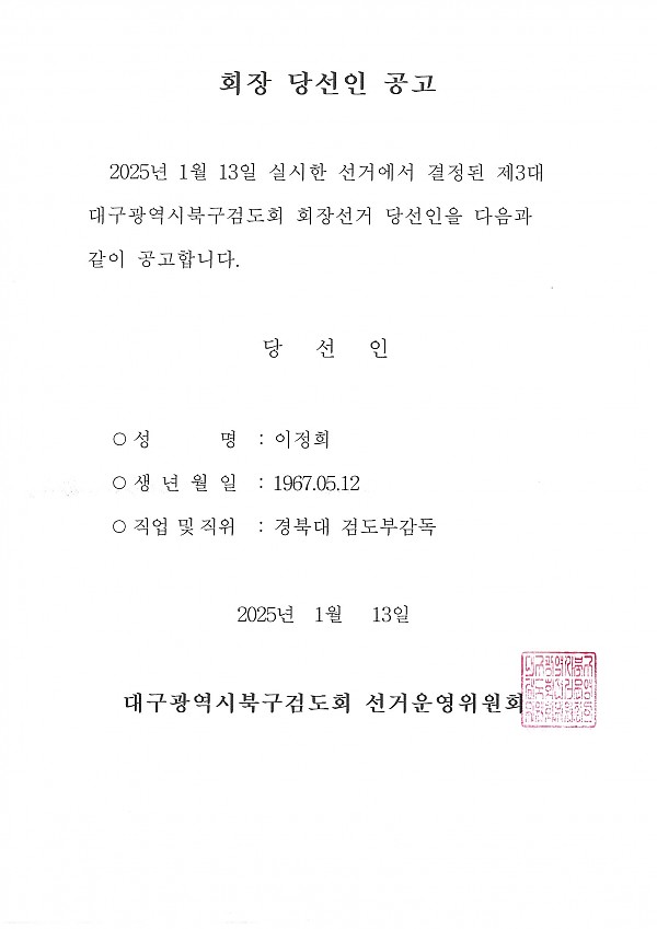 북구검도회 회장 당선인 공고 페이지 정보 작성자 관리자 작성일25-01-13 12:15 조회310회 댓글0건 이전글 다음글 목록 본문 댓글목록 등록된 댓글이 없습니다. 이전글 다음글 목록